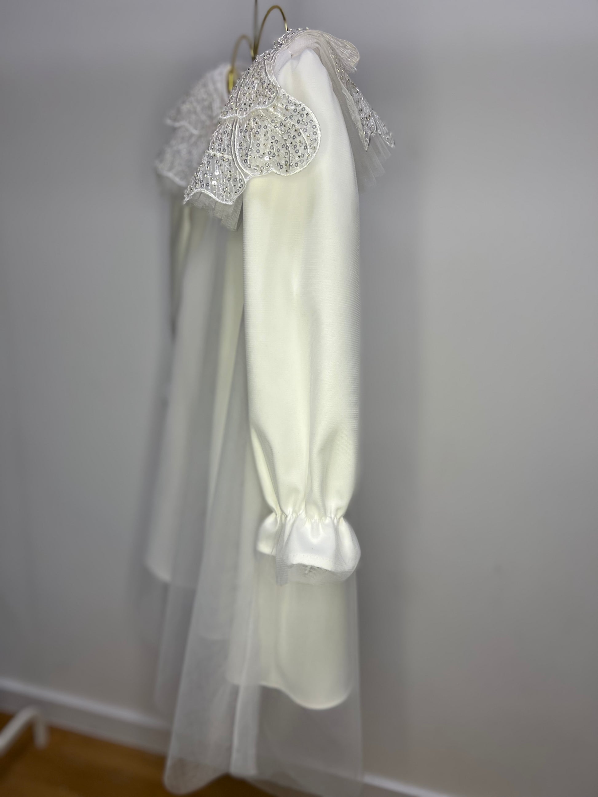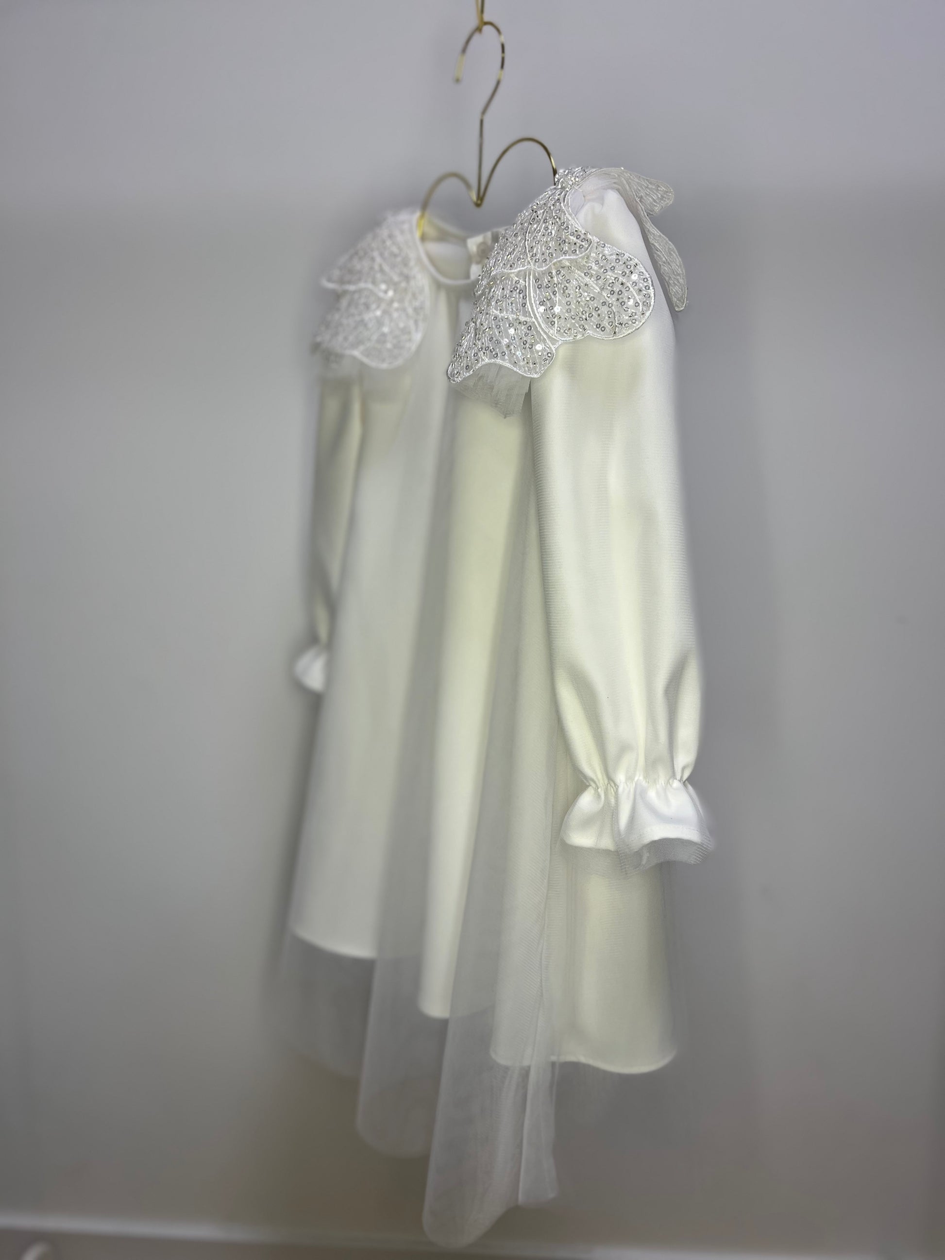 Ypatinga balta suknelė su spindinčiais sparniukais - tarsi iš pasakos! Lengvo, švelniai krentančio spindinčio audinio ir minkšto tiulio suknelė leis jaustis patogiai ir atrodyti nepriekaištingai. Suknelė su ilgomis rankovytėmis, nugaroje sagutė. Modelis platėjantis, krentantis tad mergaitėms bus patogu judėti.