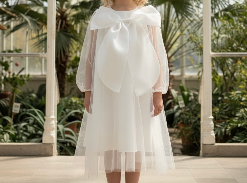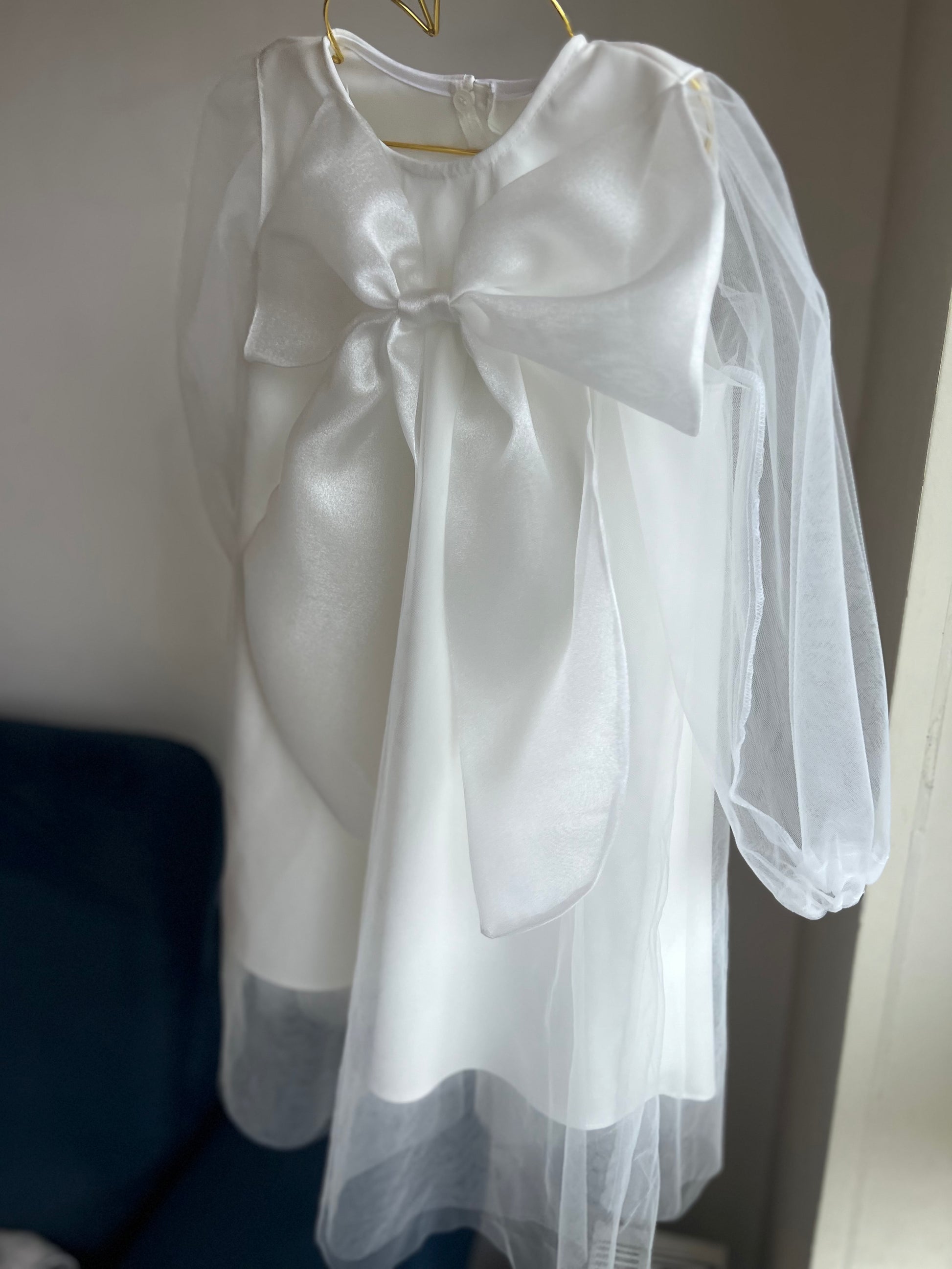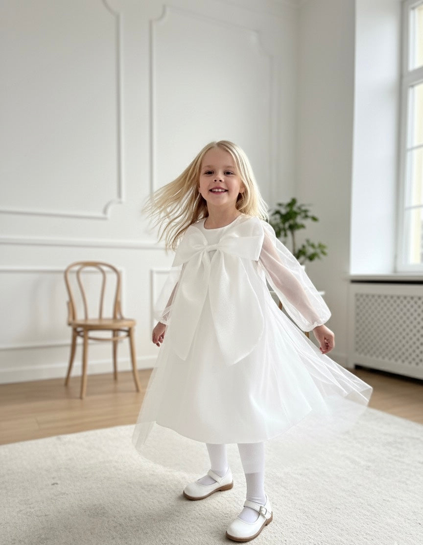 Ypatinga balta suknelė su spindinčiu kaspinu - tarsi iš pasakos! Lengvo, švelniai krentančio audinio ir minkšto tiulio suknelė leis jaustis patogiai ir atrodyti nepriekaištingai. Suknelė su ilgomis tiulio rankovytėmis, nugaroje sagutė. Modelis platėjantis, krentantis tad mergaitėms bus patogu judėti.
