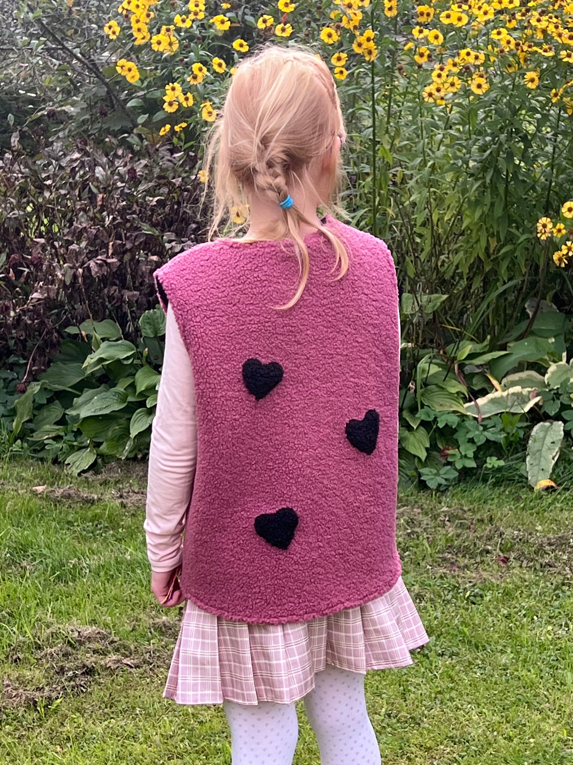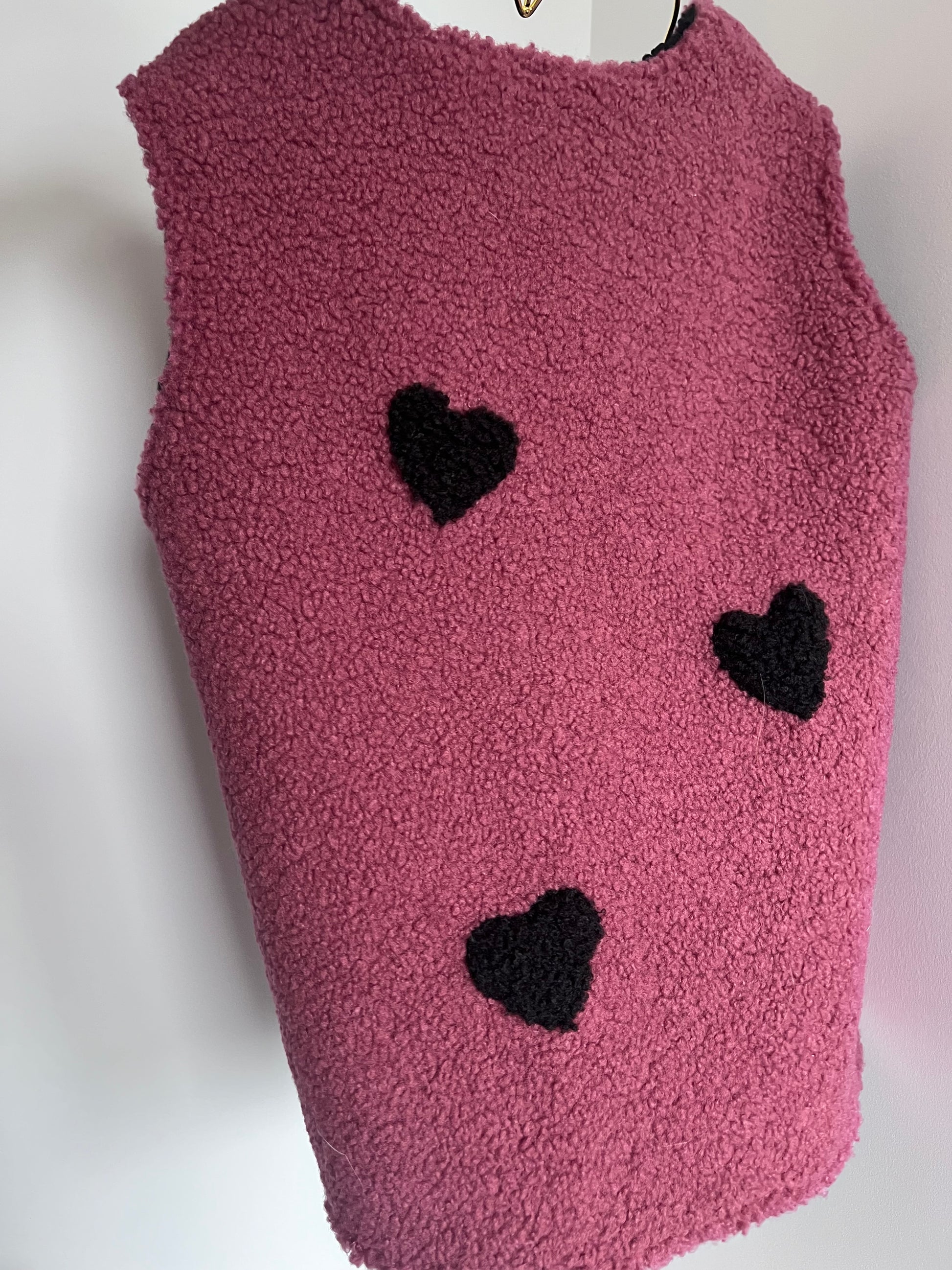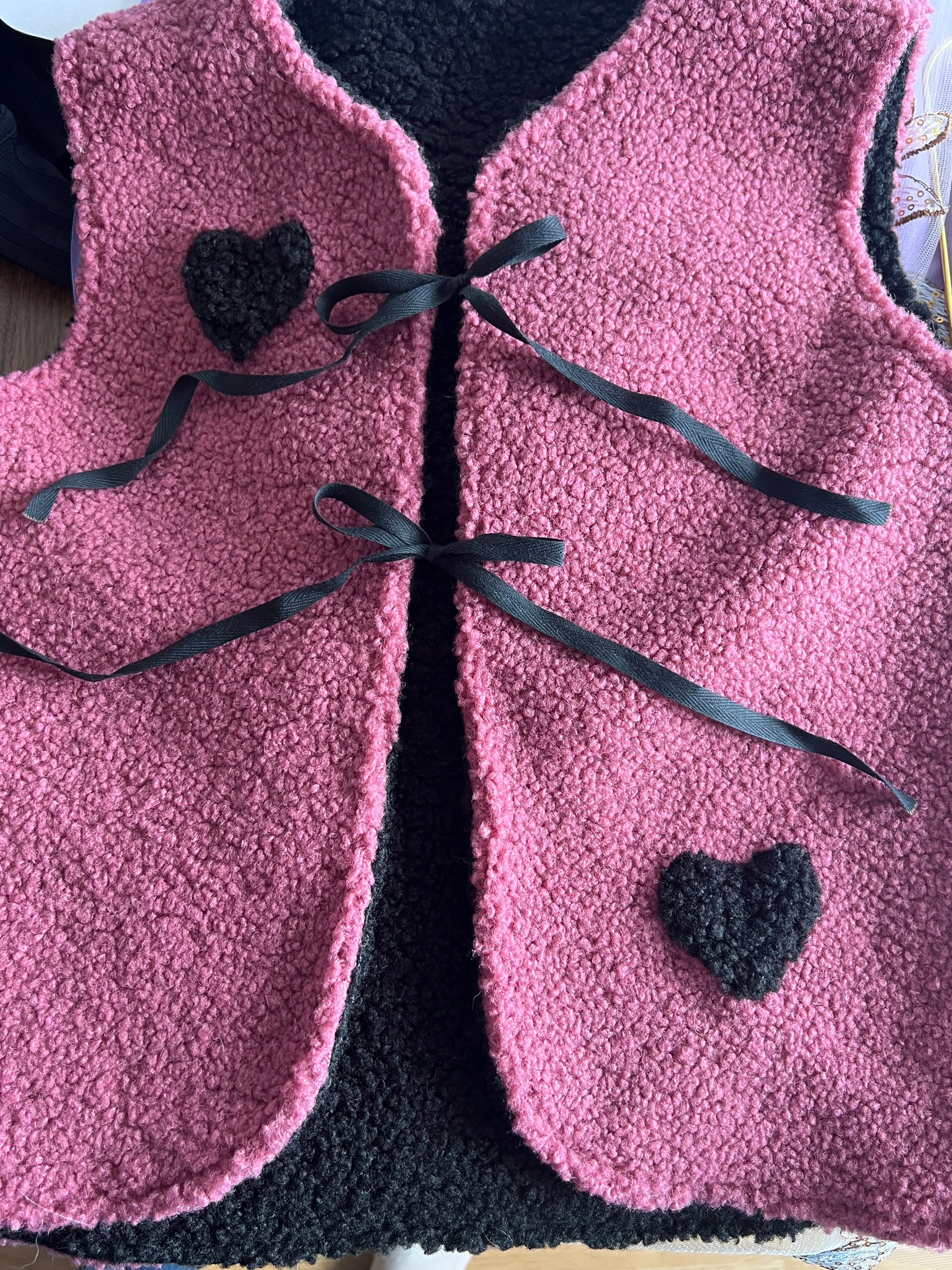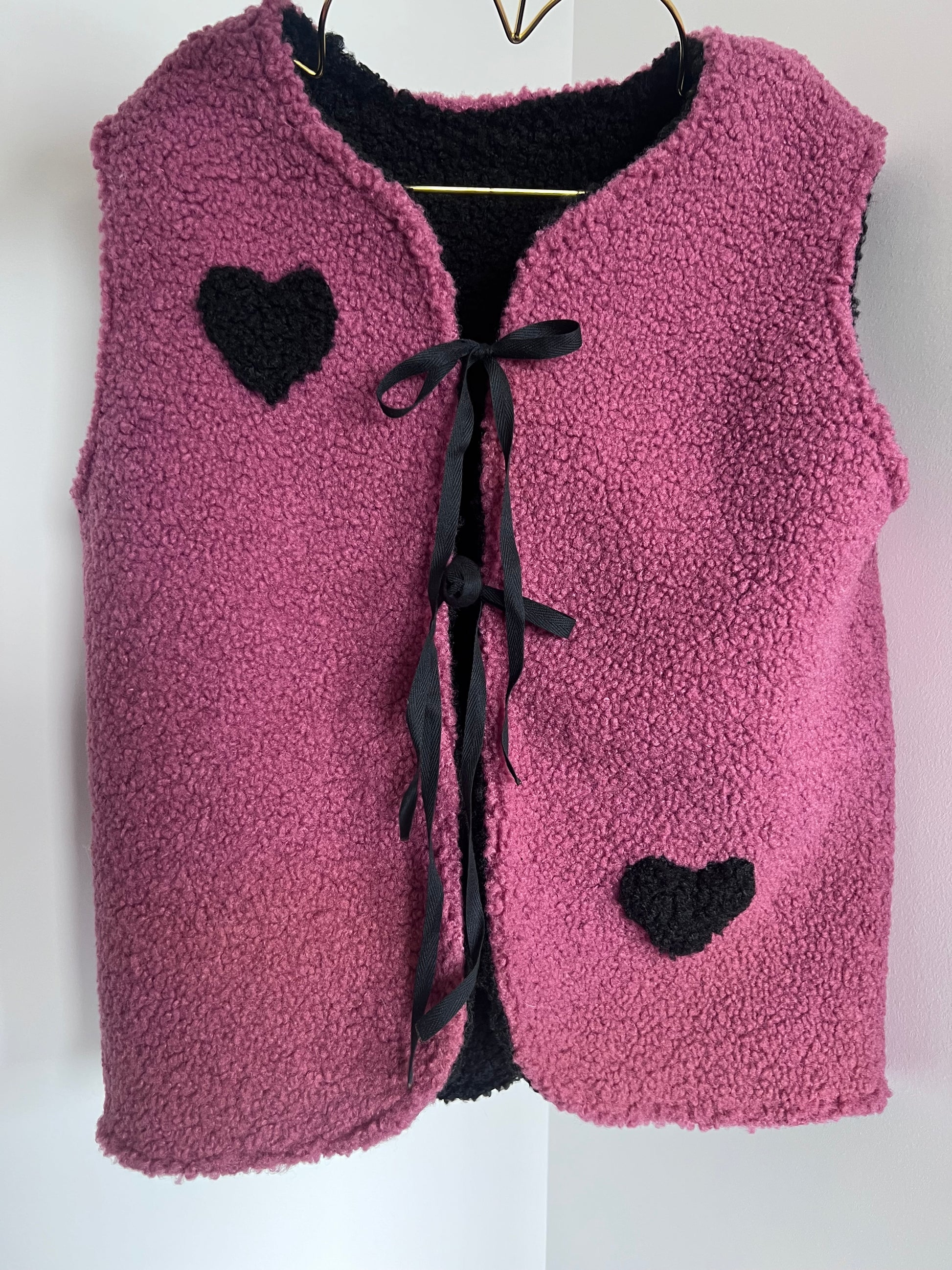 Minkštutės, šiltos ir ypatingai žavios – šios liemenės tikrai taps jaukumo bei stiliaus akcentu! Viena pusė pasiūta iš švelnaus juodo tedžio audinio, kita – avietinės spalvos su žaismingomis širdelėmis.