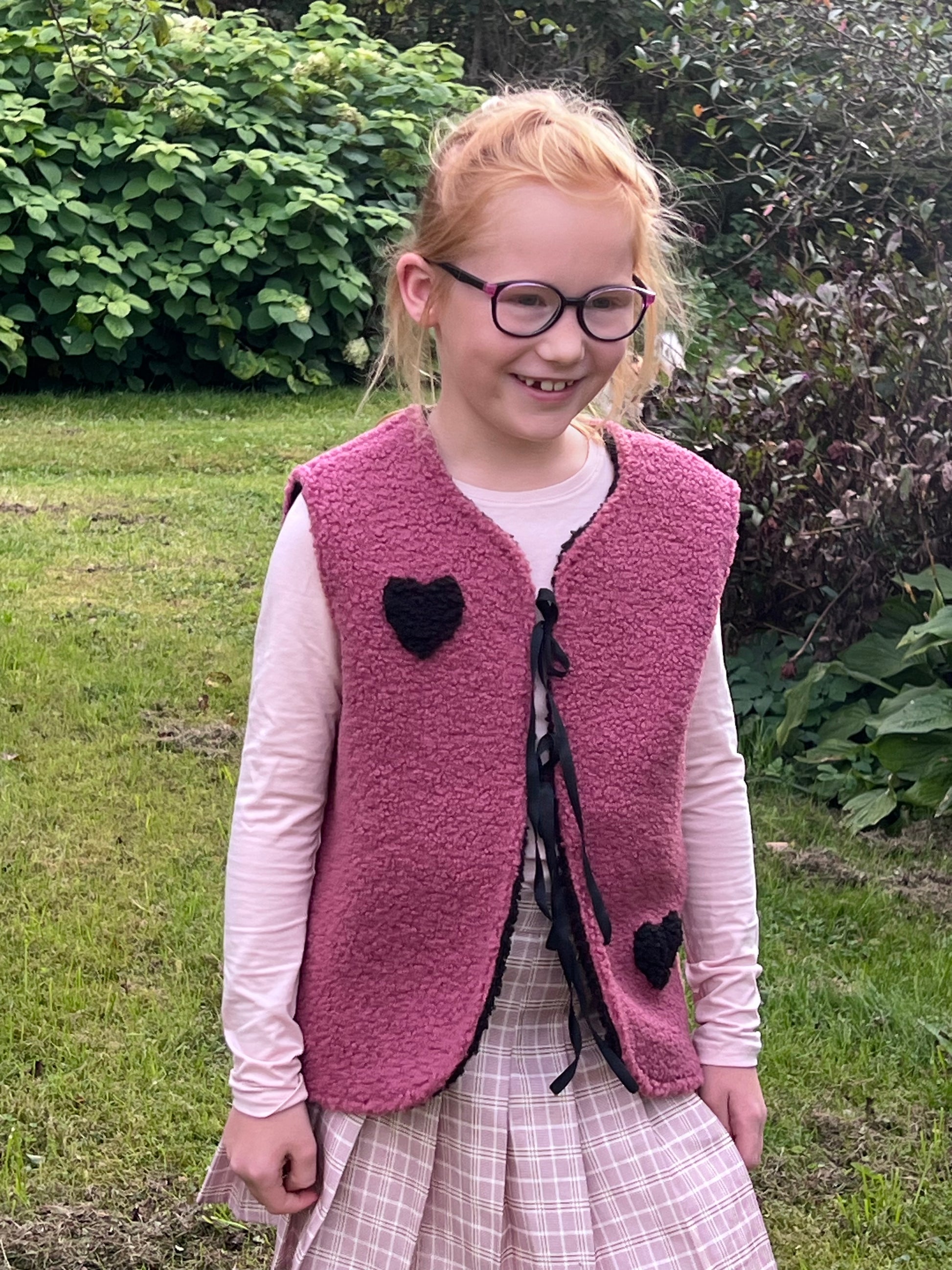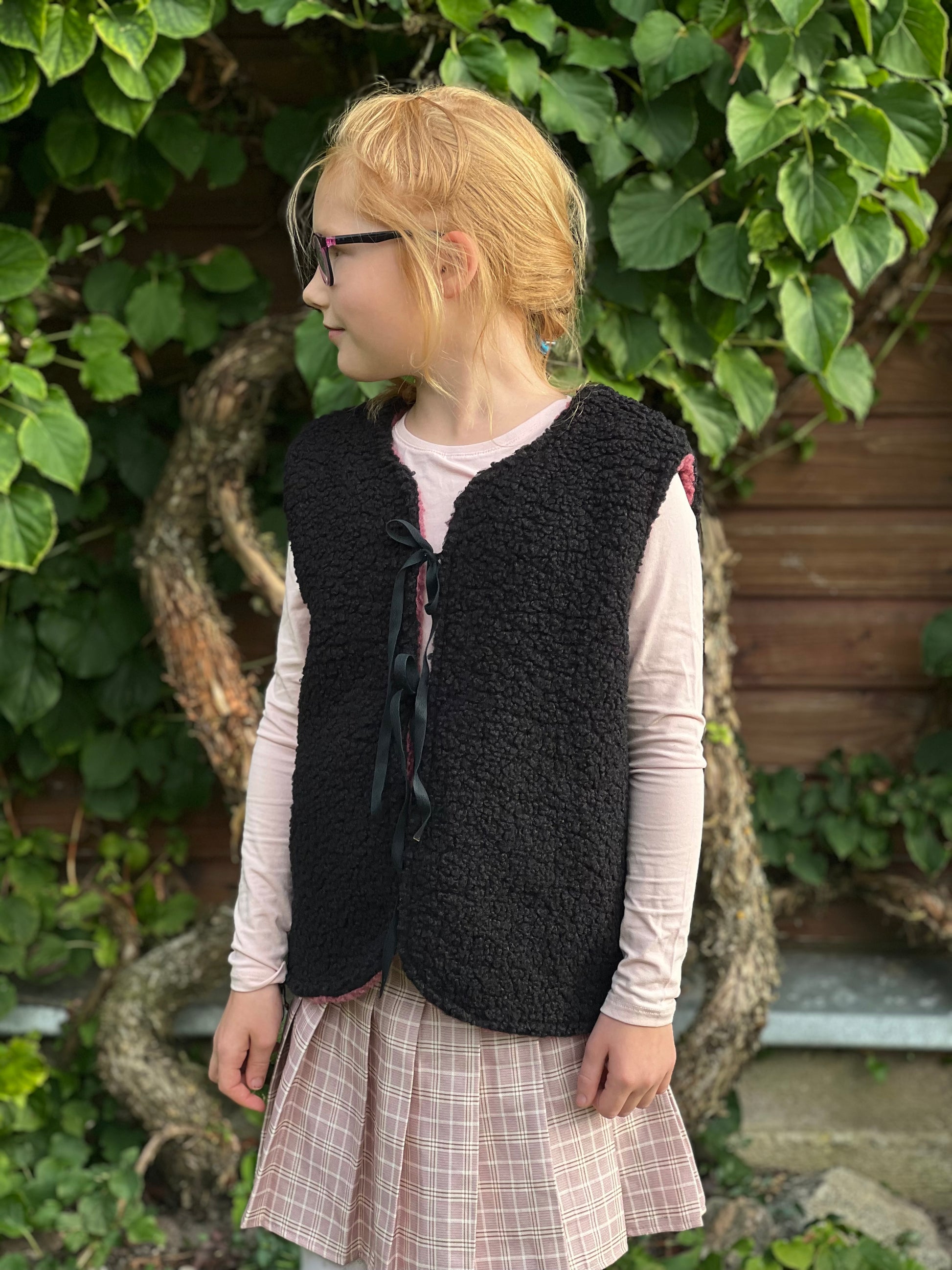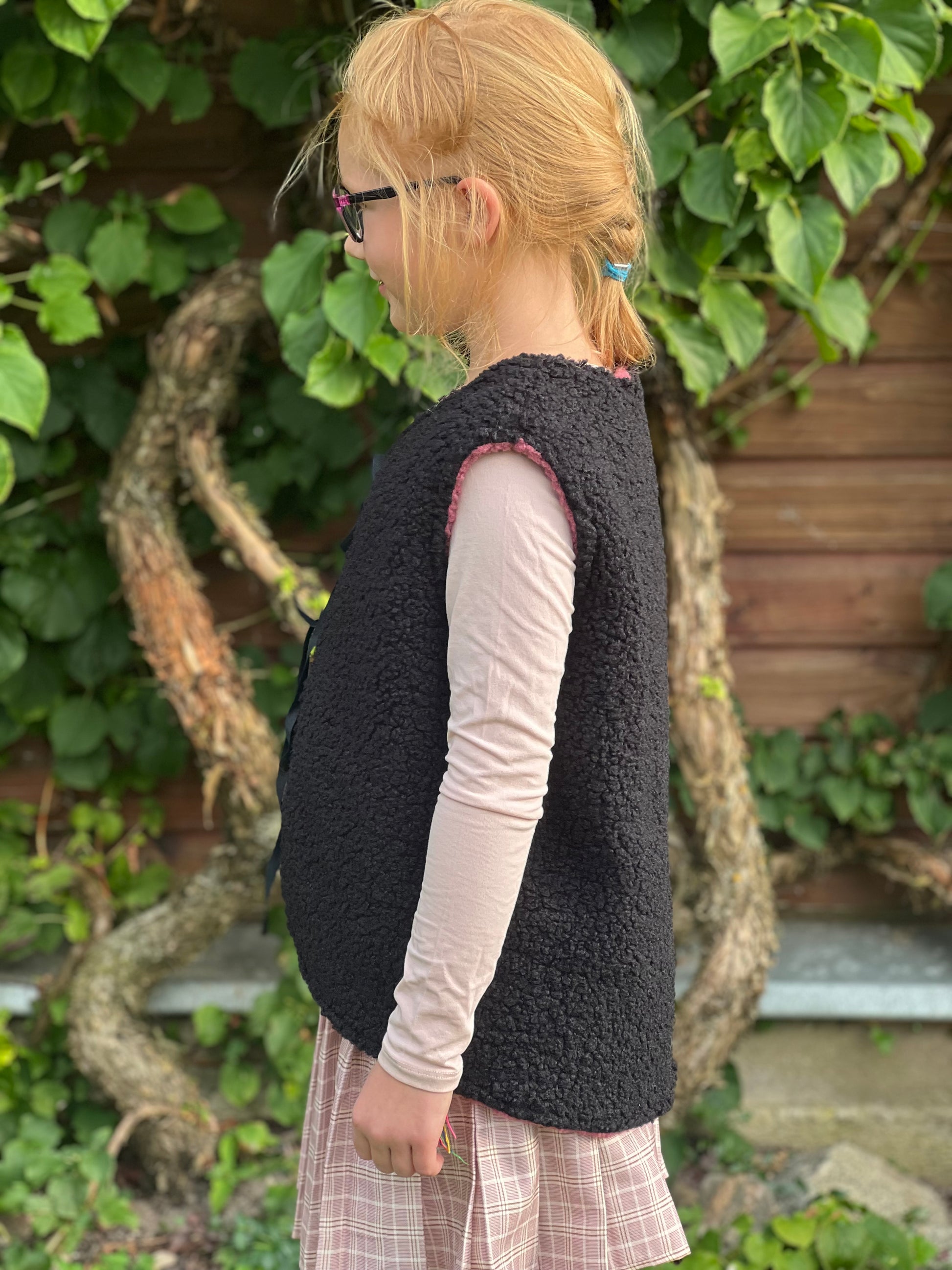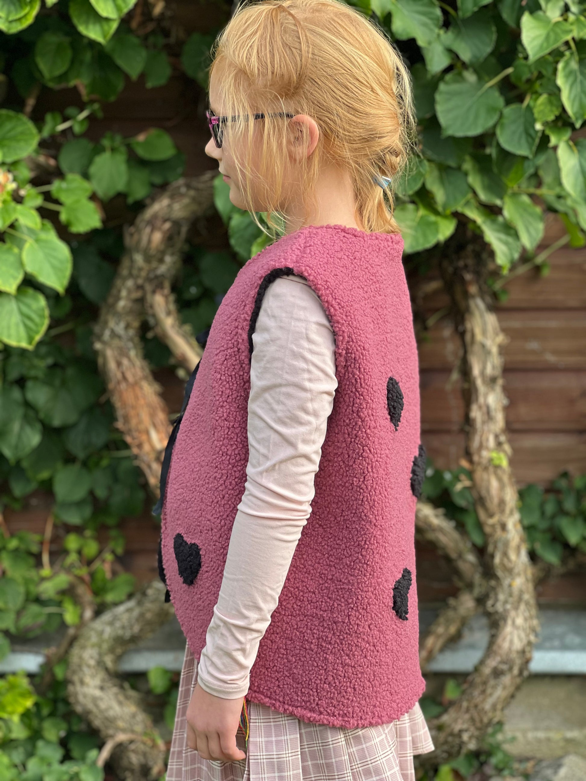 Minkštutės, šiltos ir ypatingai žavios – šios liemenės tikrai taps jaukumo bei stiliaus akcentu! Viena pusė pasiūta iš švelnaus juodo tedžio audinio, kita – avietinės spalvos su žaismingomis širdelėmis.